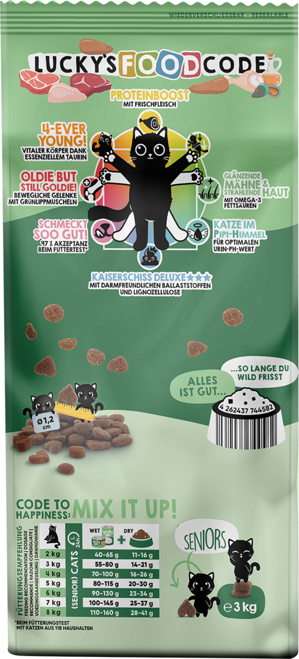 Lucky Lou Food Code je vrhunska suha hrana, saj ni le neustavljivo hrustljava in okusna, temveč vaši mački zagotavlja tudi dragocena hranila, primerna njeni starosti. Uravnotežena receptura te suhe hrane, ki jo je navdihnilo popolno razmerje Vitruvijevega človeka Leonarda da Vincija, ponuja 8 koristi na sorto in vašo mačko celostno razvaja.