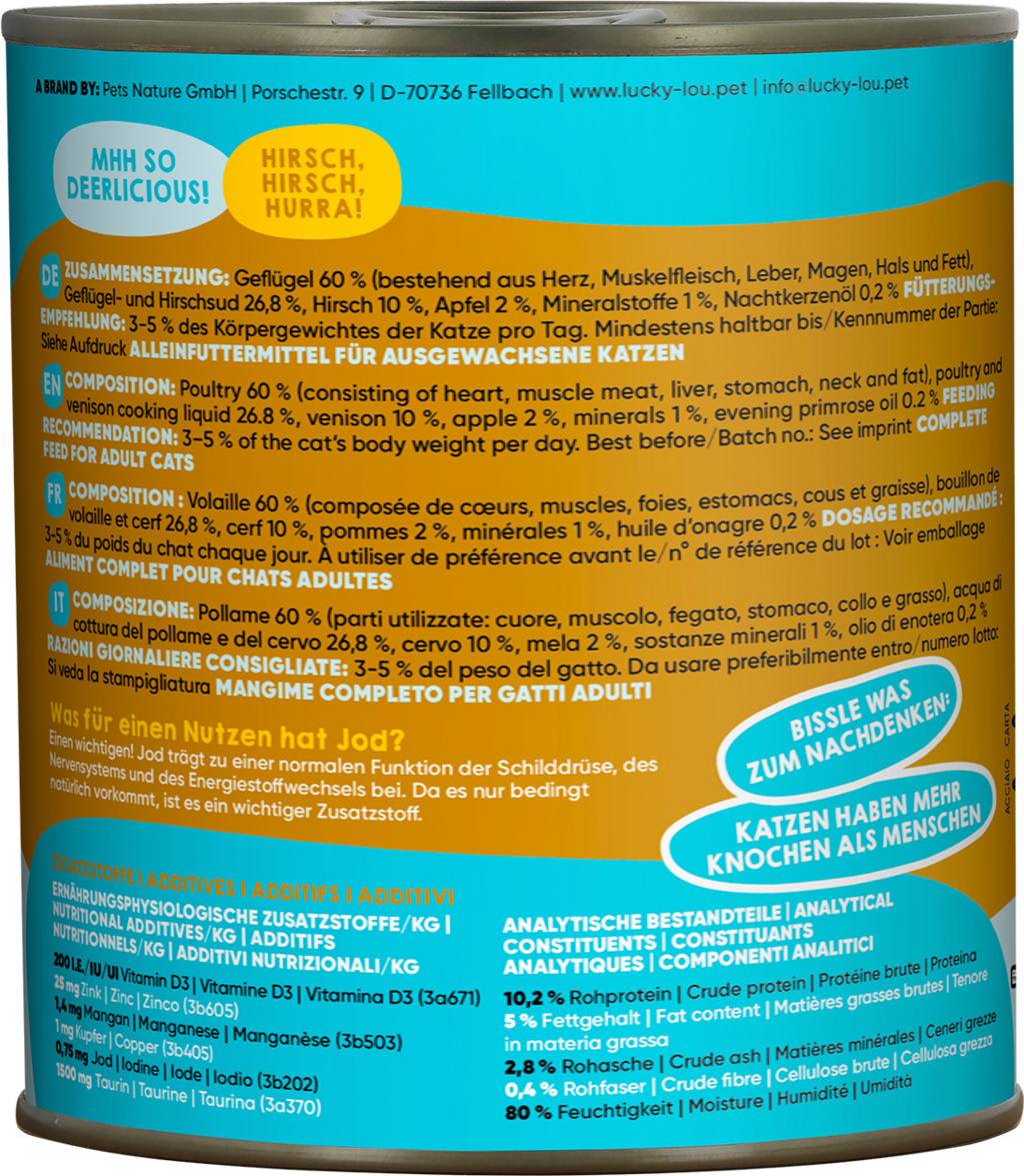 60 % perutnina (srce, Muskelfleisch, jetra, želodec, vratovina, maščoba), 26,8 % Geflügel- und Hirschsud, 10 % jelen, 2 % jabolka, 1 % minerali, 0,2 % svetlinovo olje