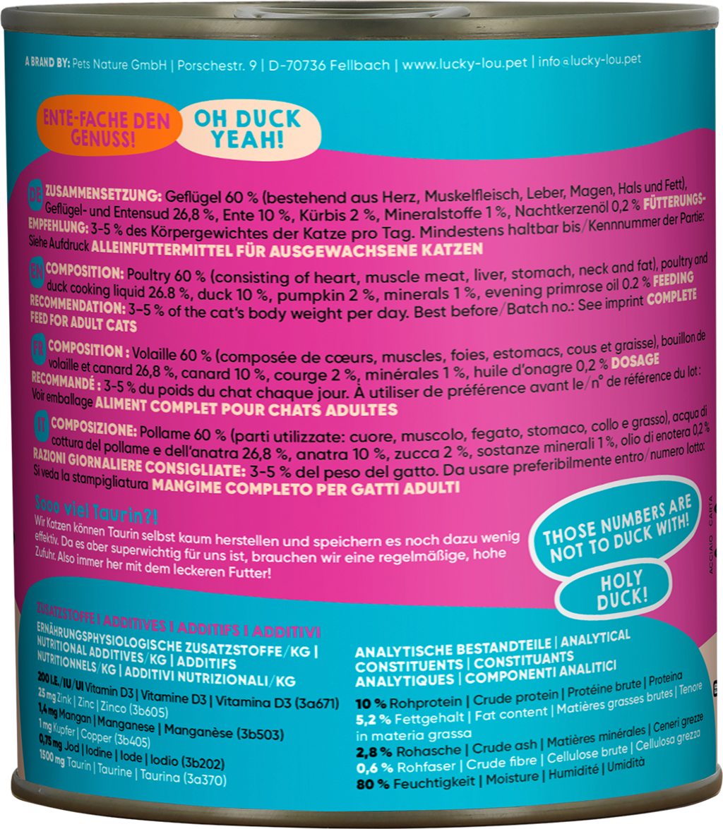 60 % perutnina (srce, Muskelfleisch, jetra, želodec, vratovina, maščoba), 26,8 % Geflügel- und Entensud, 10 % raca, 2 % buča, 1 % minerali, 0,2 % svetlinovo olje