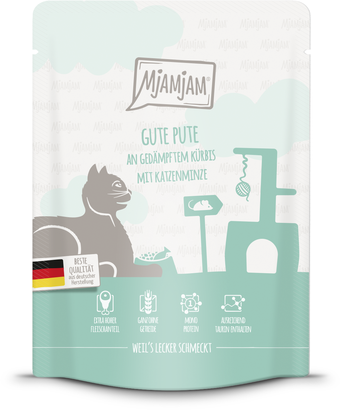 Vrečke Mjamjam razvajajo vašo mačko z bogatim okusom, neprimerljivo kakovostjo in kančkom ljubezni. Vaš ljubljenček bo prejel popoln obrok svežega purana, dušene buče in nekaj mačje mete. Vsebuje tudi tavrin, ki je pomemben za mačke.
