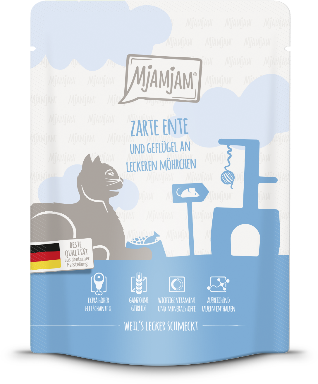Vrečke Mjamjam razvajajo vašo mačko z bogatim okusom, neprimerljivo kakovostjo in kančkom ljubezni. Vaša mačka bo prejela popoln obrok svežega račjega mesa, sočne perutnine in hrustljavega korenja. Vsebuje tudi tavrin, ki je pomemben za mačke.
