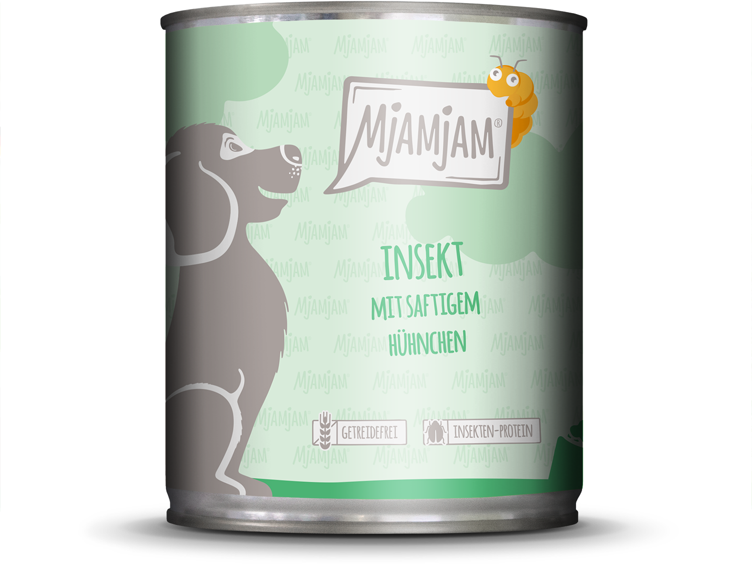 Mjamjamova mokra hrana vašega psa razvaja z bogatim okusom, neprimerljivo kakovostjo in kančkom ljubezni. Vaš štirinožni prijatelj lahko pričakuje polnovreden obrok iz antialergenih insektov in sočnega piščanca.