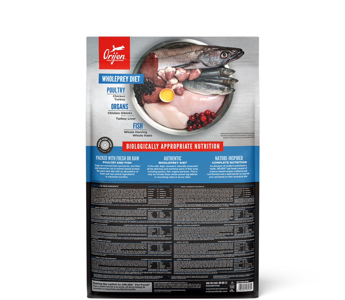 Hrana Orijen Original je primerna za vse pasme psov vseh starosti. To pomeni, da lahko s hrano hranite tako mladičke kot odrasle in starejše pse. Hrana vsebuje visokokakovostne sestavine iz perutnine in rib.