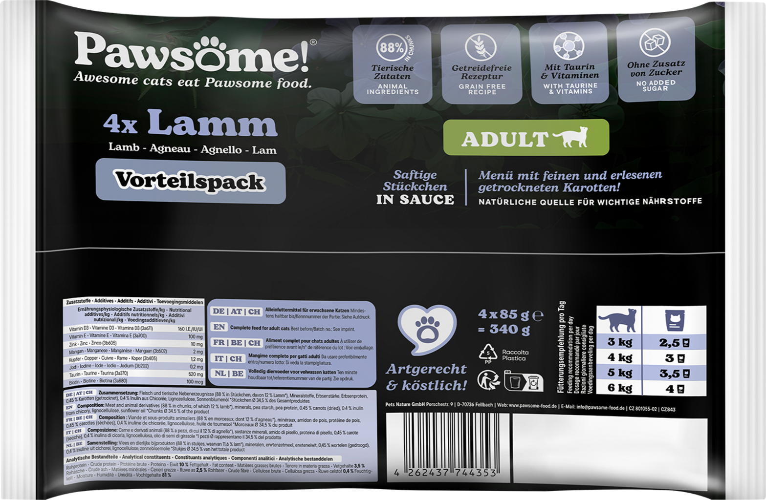 Izkušnenj v jeziku slovenščina za izdelek Pawsome! Mokra mačja hrana Adult - jagnjetina
