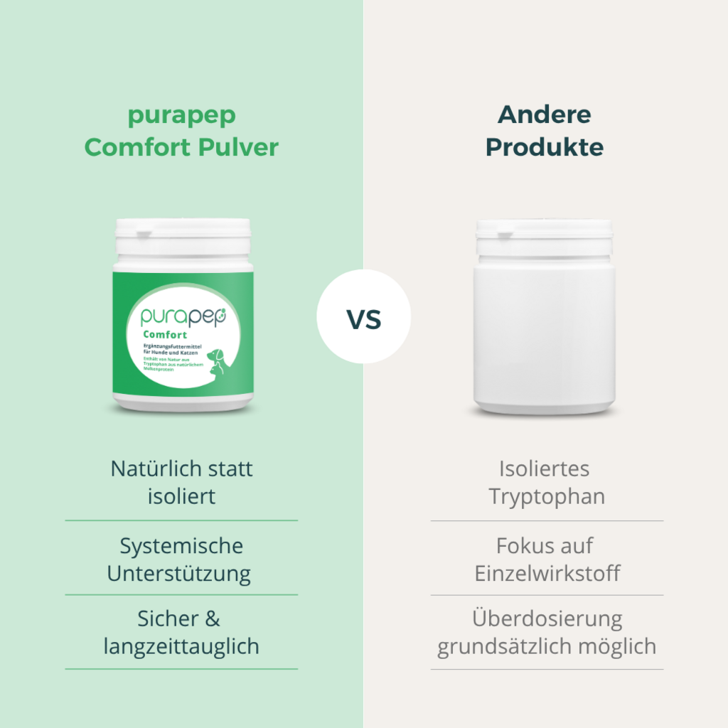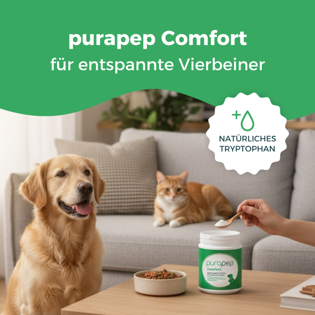 Purapep Comfort je visokokakovostna dopolnilna hrana v obliki prahu, ki je bila razvita za naravno podporo mačkam in psom v stresnih situacijah.