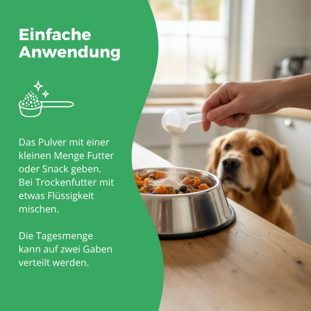Prašek lahko enostavno vmešate v hrano. Za suho hrano priporočamo, da prašek zmešate z malo tekočine. Dnevno količino lahko razdelite na dva odmerka.