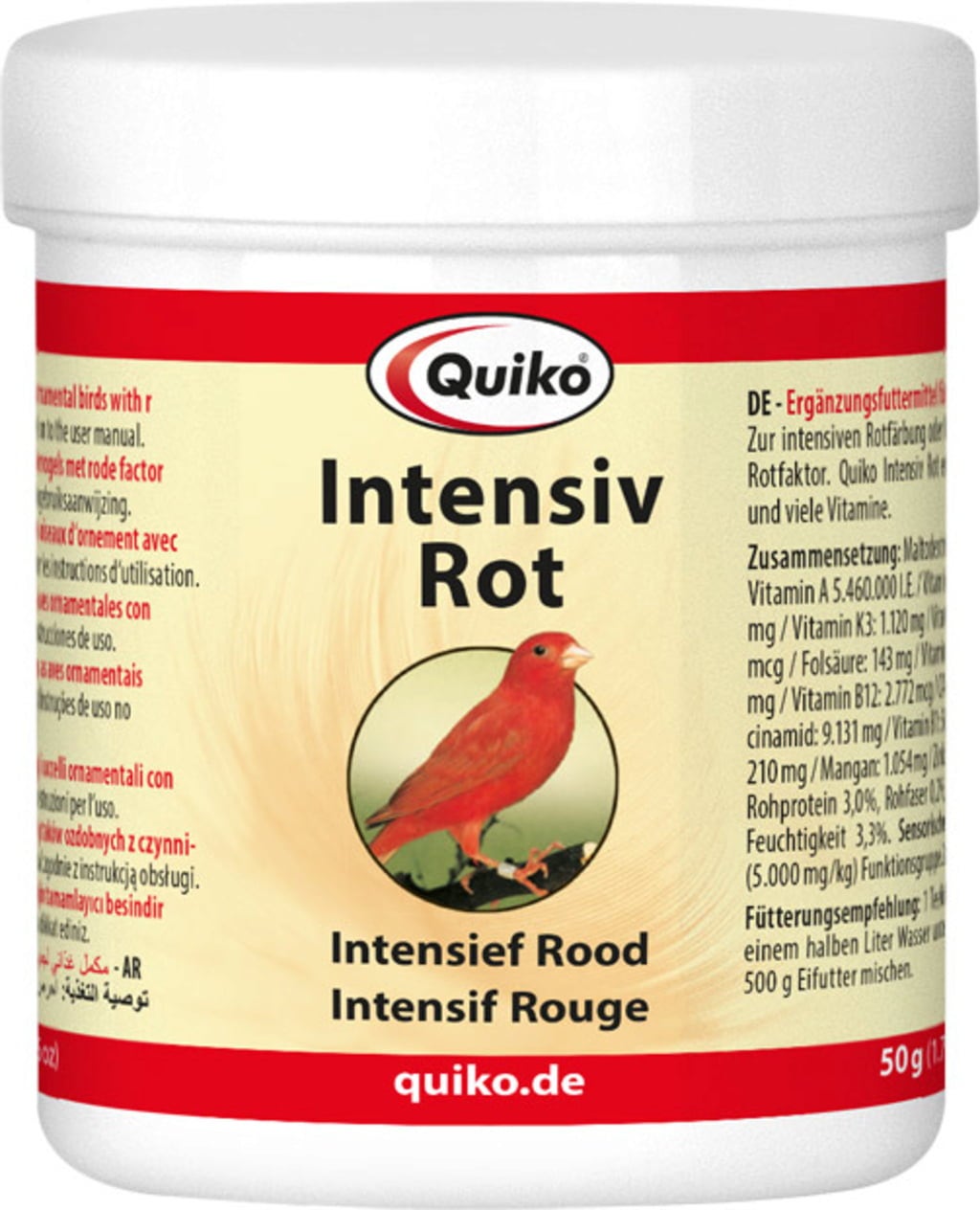 Pozor! Quiko Intensive Red se sme dajati okrasnim pticam le do 1 % dnevnega obroka zaradi višje vsebnosti vitaminov A, D3 in elementov v sledovih v primerjavi s popolnimi krmili.