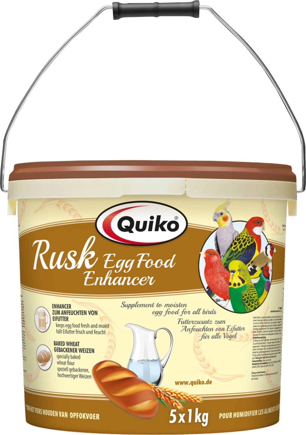 - Zmešajte 1 del Rusk Quiko s 4 deli hrane za gojenje, jajčne hrane ali mehke hrane in vse enakomerno premešajte.