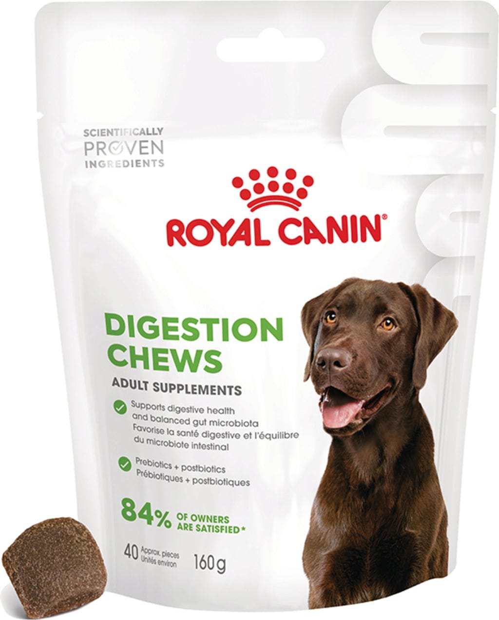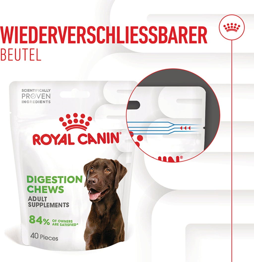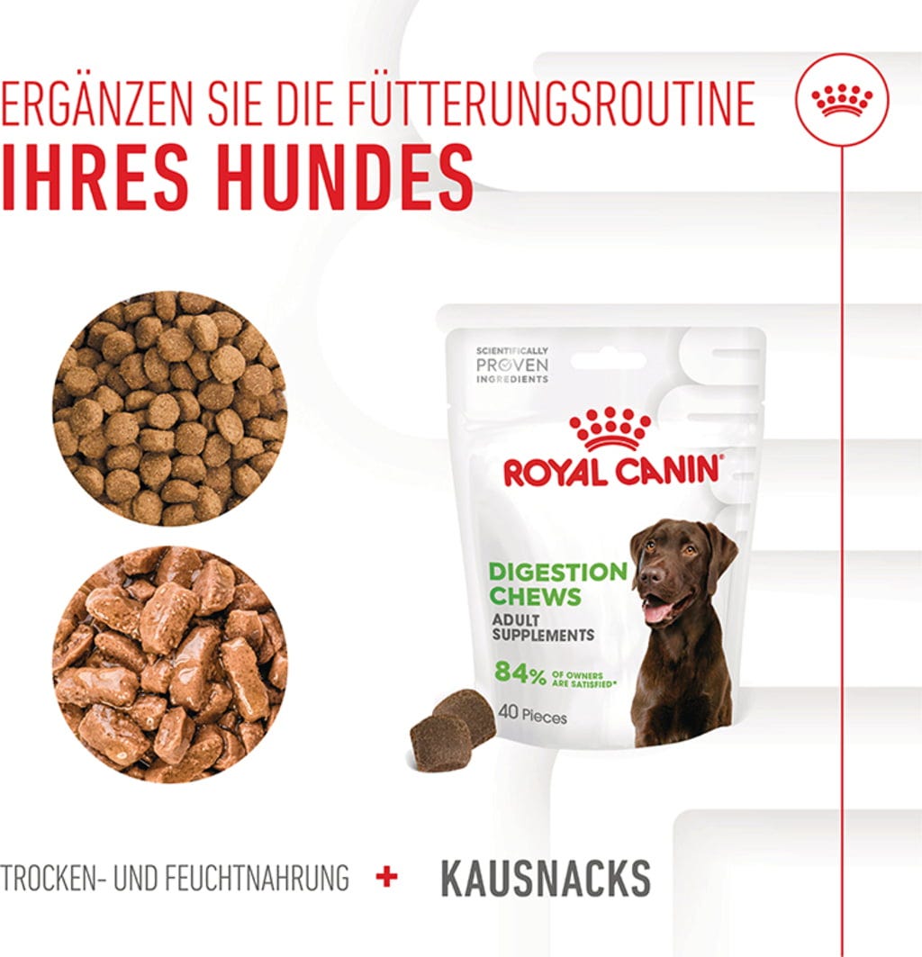 Prehranska dopolnila za odrasle pse ROYAL CANIN® DIGESTION CHEWS se odlično dopolnjujejo in podpirajo zdravo prebavo ter uravnotežen črevesni mikrobiom vašega psa. Na ta način lahko vaš pes ohrani svojo običajno prehrano in še naprej prejema ciljno usmerjeno podporo zdravju.