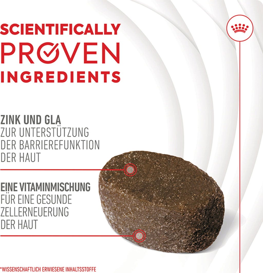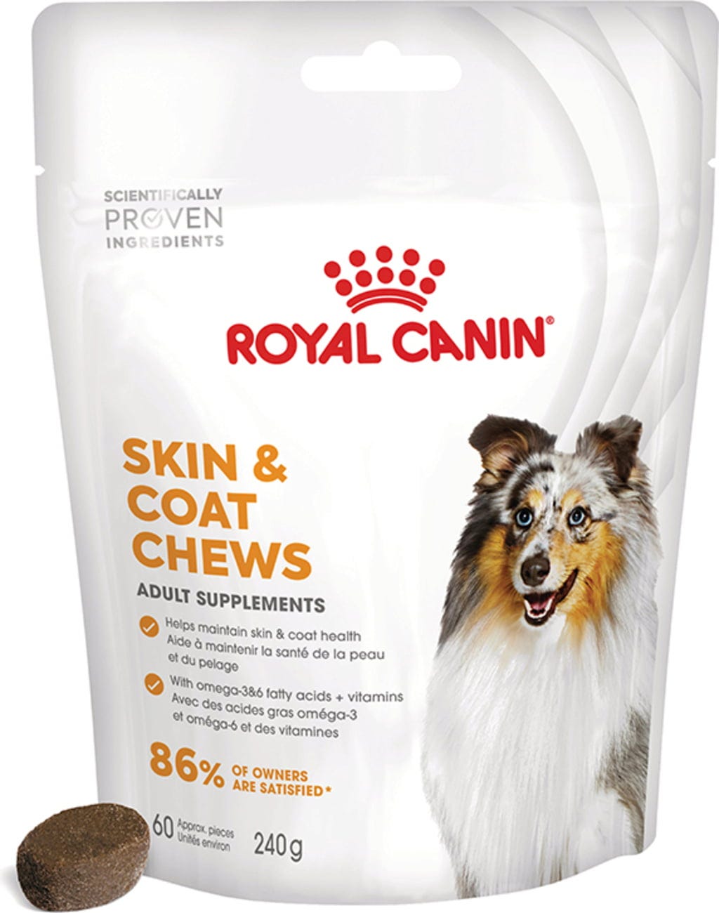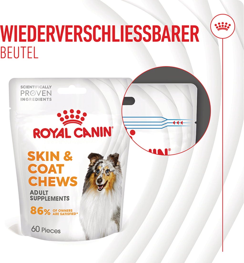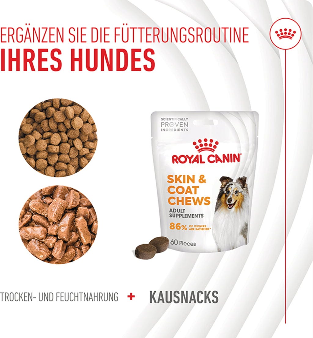 Prehranska dopolnila za odrasle pse ROYAL CANIN® SKIN & COAT CHEWS se odlično dopolnjujejo in podpirajo zdravo kožo in lepo dlako. Na ta način lahko vaš pes ohrani svojo običajno prehrano in še naprej prejema ciljno usmerjeno podporo zdravju.