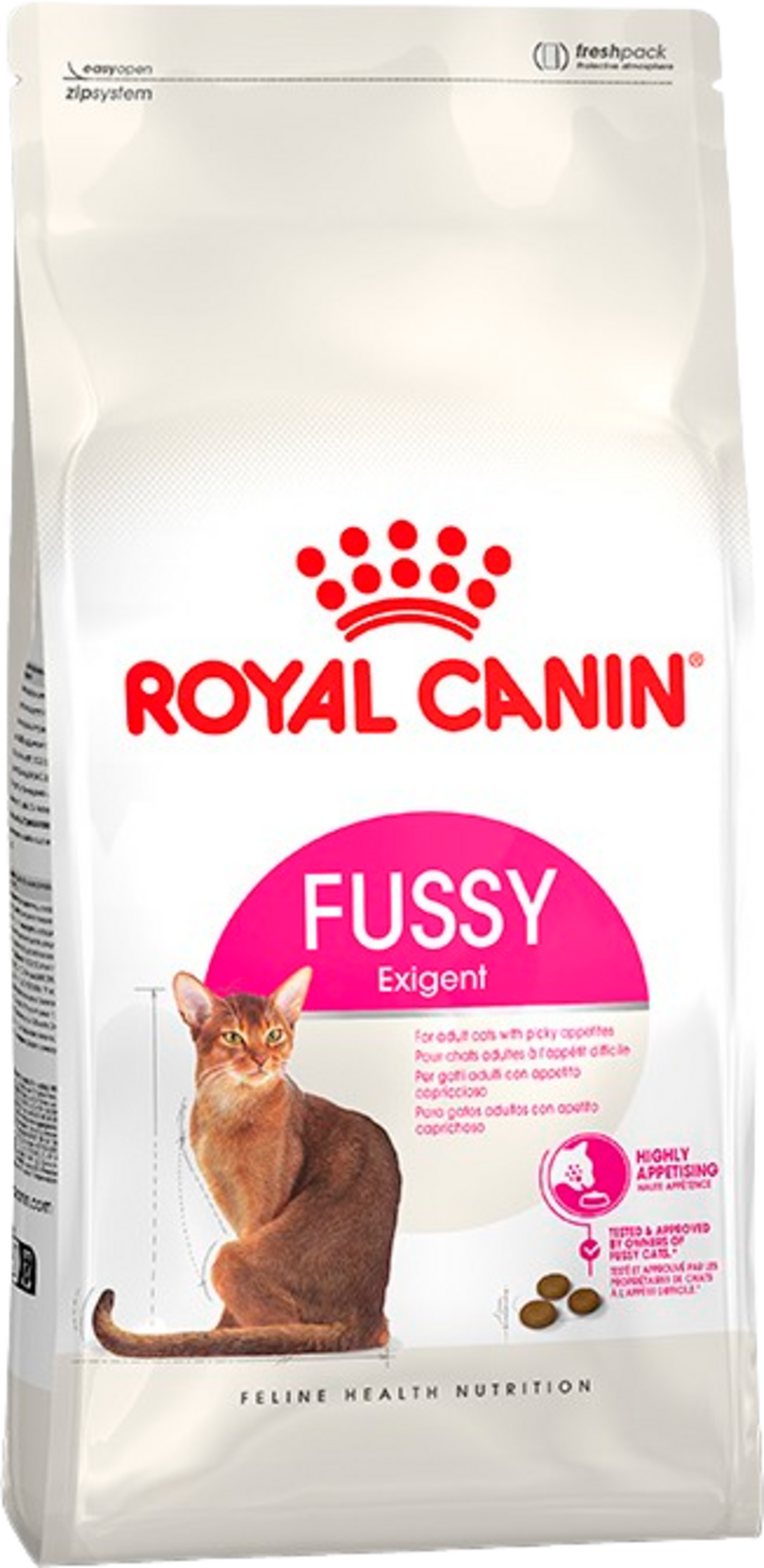 Da bi najzahtevnejšim mačkam ponudili prehrano z izjemnim okusom, sestava hrane Fussy združuje 3 prejšnje formule Exigent (Savour, Aroma in Protein) v enem samem izdelku: Fussy by ROYAL CANIN®.