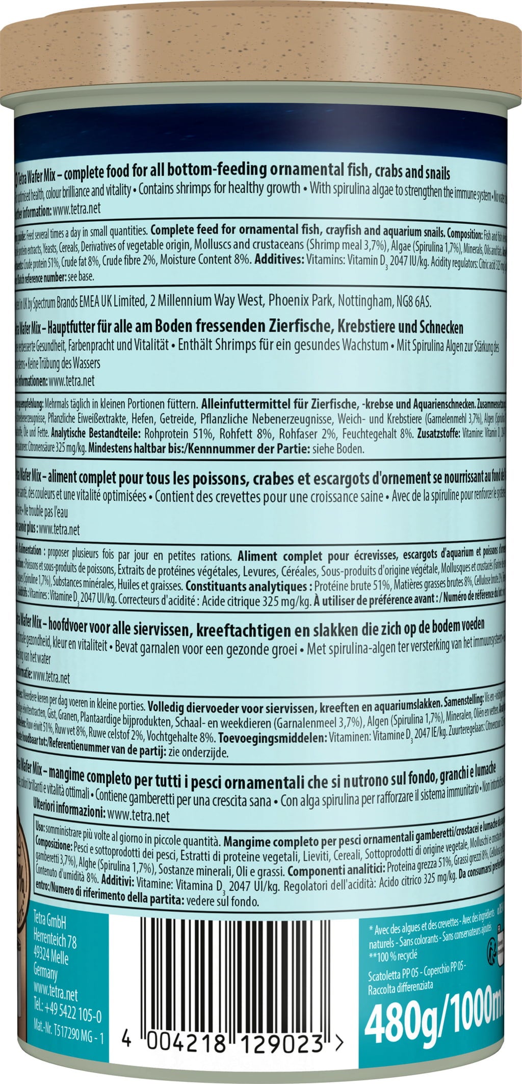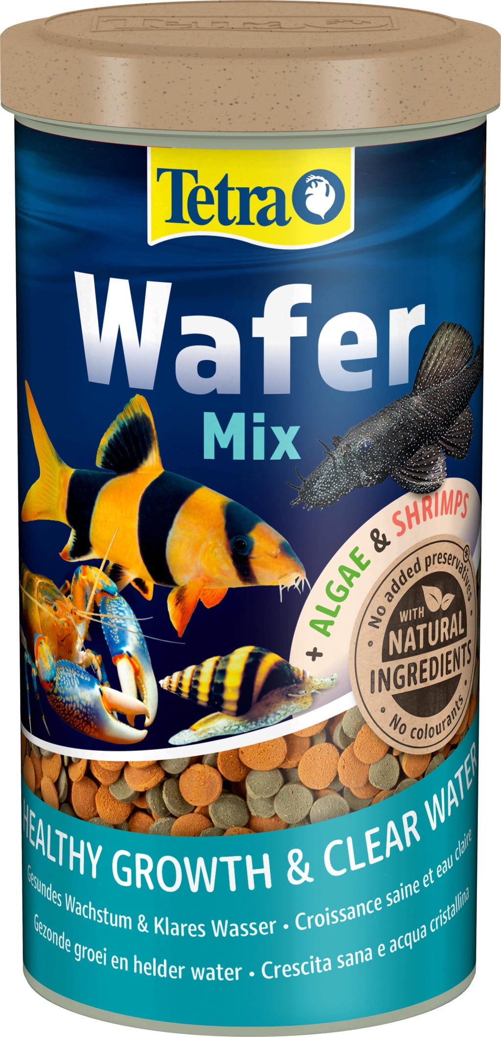 Tetra Wafer Mix je vrhunska hrana v obliki rezin za vse talne ribe in rake v sladkovodnih akvarijih in je na voljo v različnih posodah.