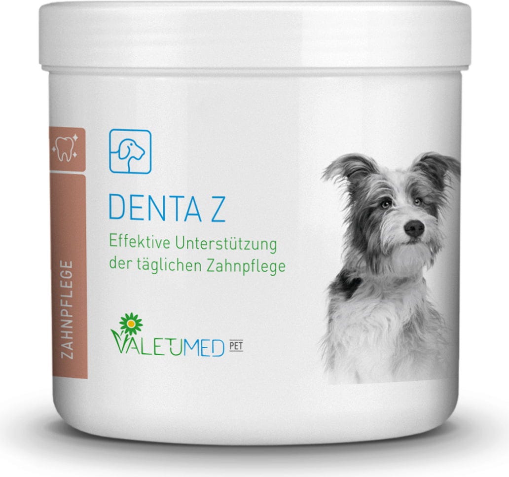 Dopolnilna krmna mešanica Denta Z znamke Valetumed združuje preizkušene sestavine za naravno podporo vsakodnevni negi zob vašega psa. Redna ustna higiena je pomemben gradnik za negovan občutek v gobcu vašega štirinožca.