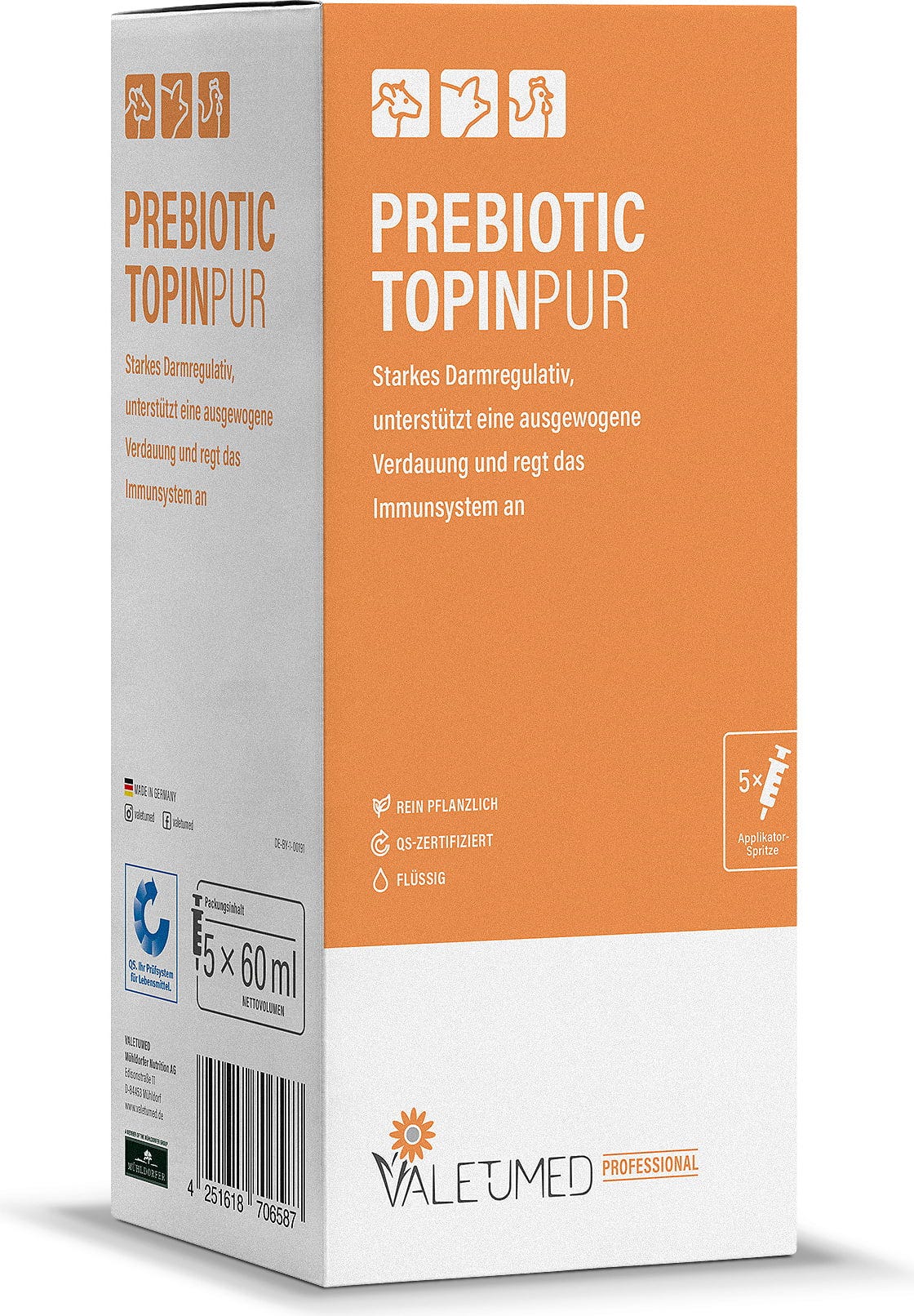 Posamična krmna mešanica Valetumed Professional Prebiotic TopinPur je sestavljena iz čistega, mlečnokislinsko fermentiranega koncentrata soka topinamburja. Razvita je bila posebej za govedo, prašiče in perutnino, da naravno podpira normalno črevesno floro. Zaradi visoke vsebnosti inulina izdelek ponuja dragoceno osnovo za podporo normalne prebave v vsakdanu na kmetiji.