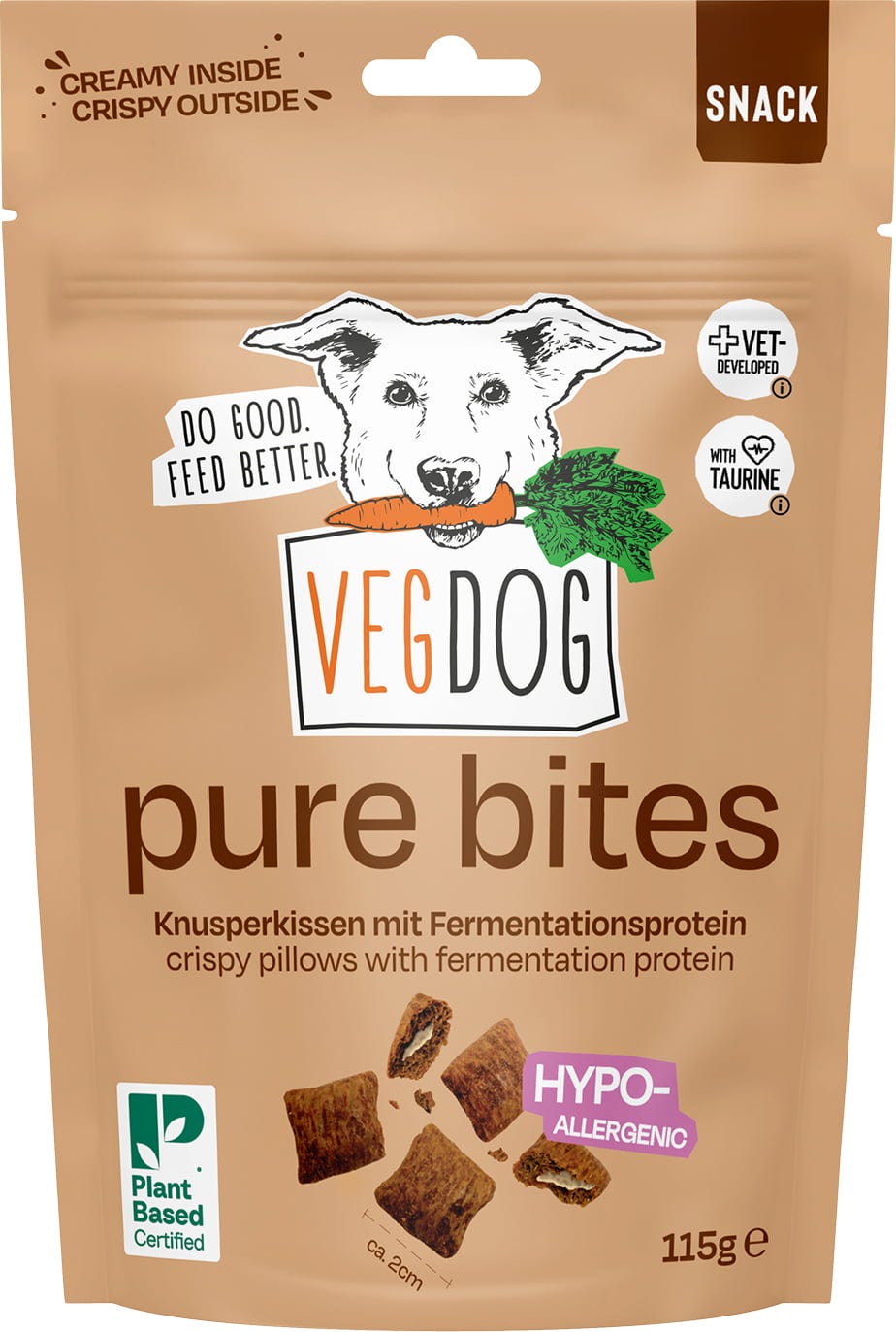 Pure Bites znamke VEGDOG vsebujejo več kot 14 % fermentacijskih beljakovi, to je okolju prijazna in hkrati izjemno okusna alternativa živalskim ali rastlinskim beljakovinam. Ti okusni priboljški so od zunaj prijetno hrustljavi, znotraj pa kremasti. Poleg tega vsebujejo tavrin in so popolnoma brez umetnih arom ter barvil.