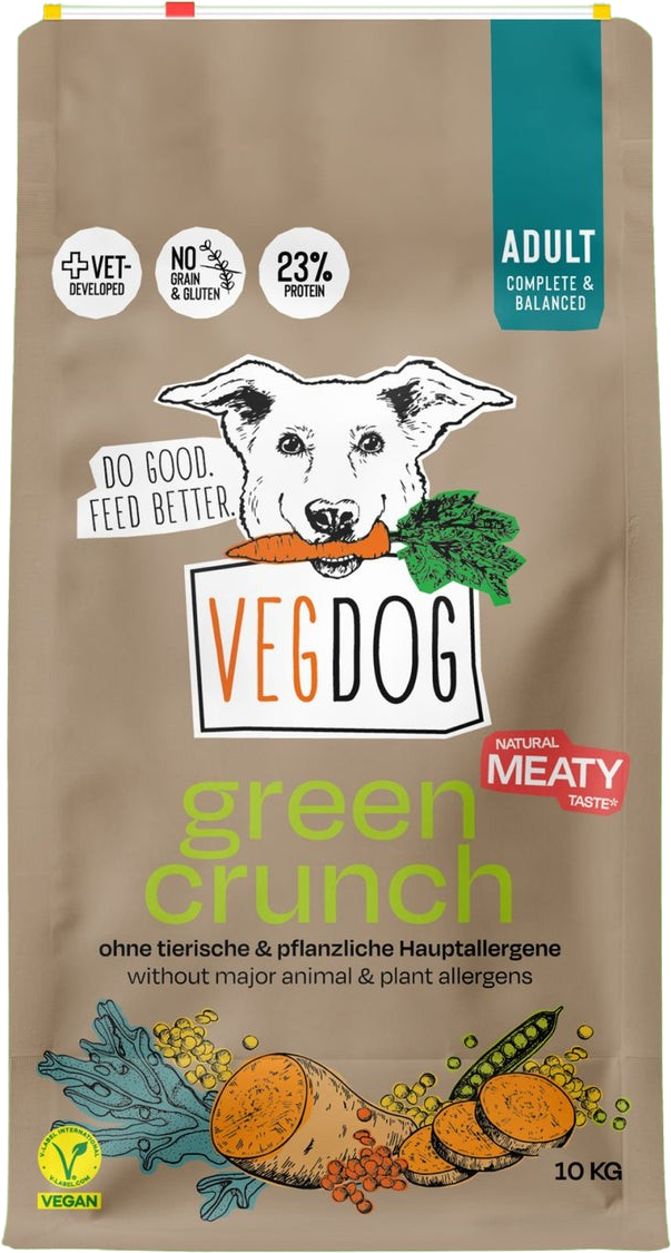 Green Crunch iz VEGDOG zagotavlja zdrave in uravnotežene obroke za štirinožne prijatelje, ki imajo radi nekaj hrustljavega v svoji skledi! Veganska suha hrana uporablja rastlinski vir beljakovin iz leče in graha namesto živalskega vira beljakovin. Dragoceno in hkrati okusno recepturo oplemenitijo slastne alge, bogate z omega-3 in omega-6 maščobnimi kislinami ter sladki krompir, buče, korenje, borovnice in posebna mineralna mešanica VEGDOG.
