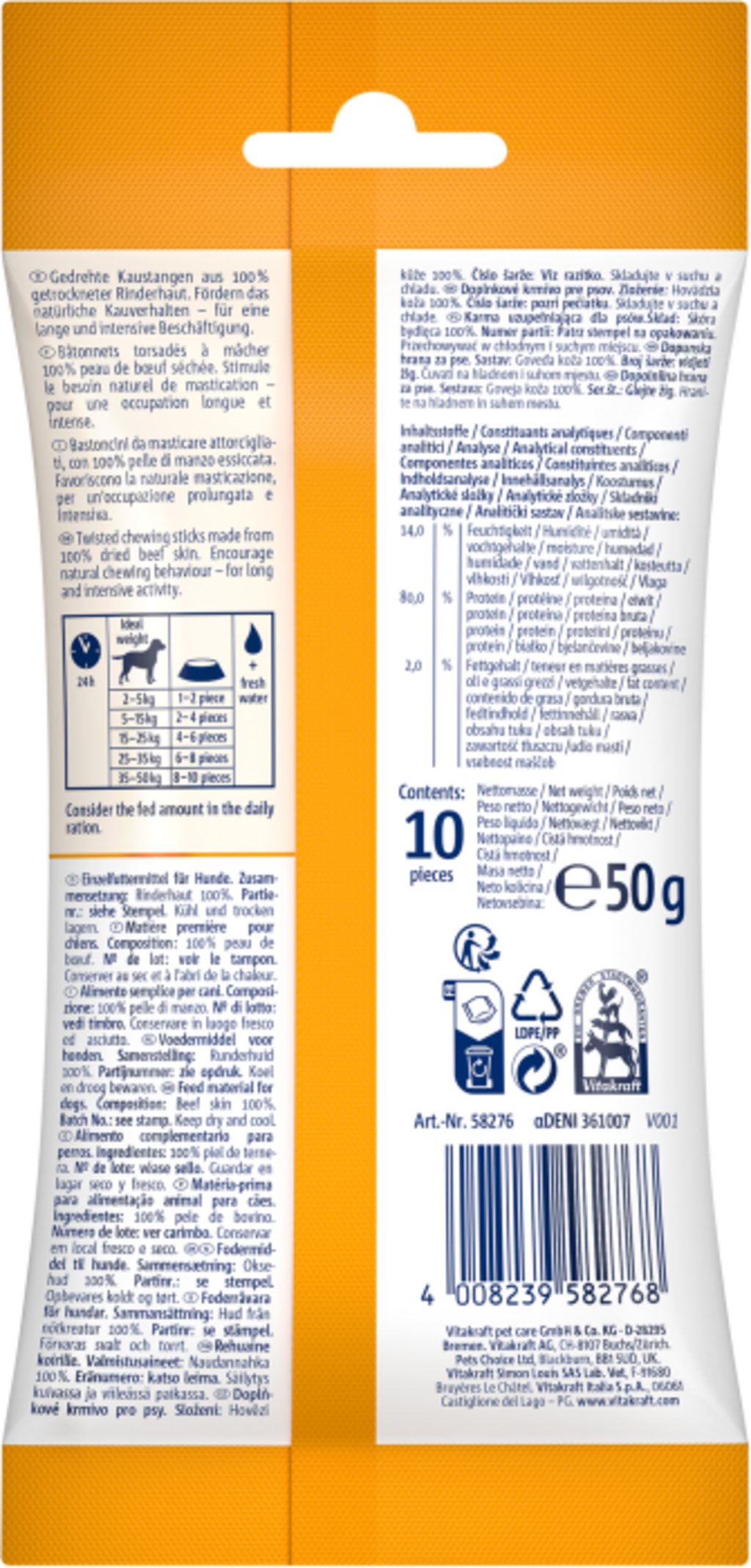 100% posušena in zvita goveja koža nudi vašemu psu dolgotrajen užitek pri žvečenju in zagotavlja aktivnost, primerno vrsti.