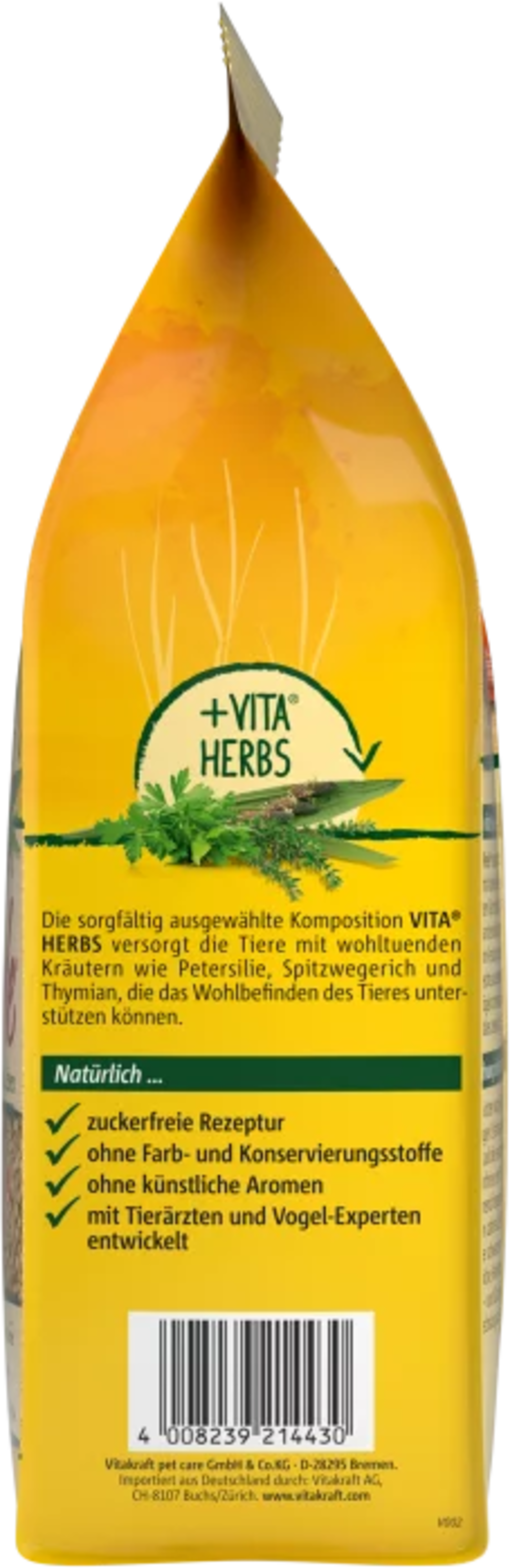 - Uravnotežena formula s semeni, žiti, listi evkaliptusa, koščki korenja in posebno zeliščno sestavo VITA® HERBS