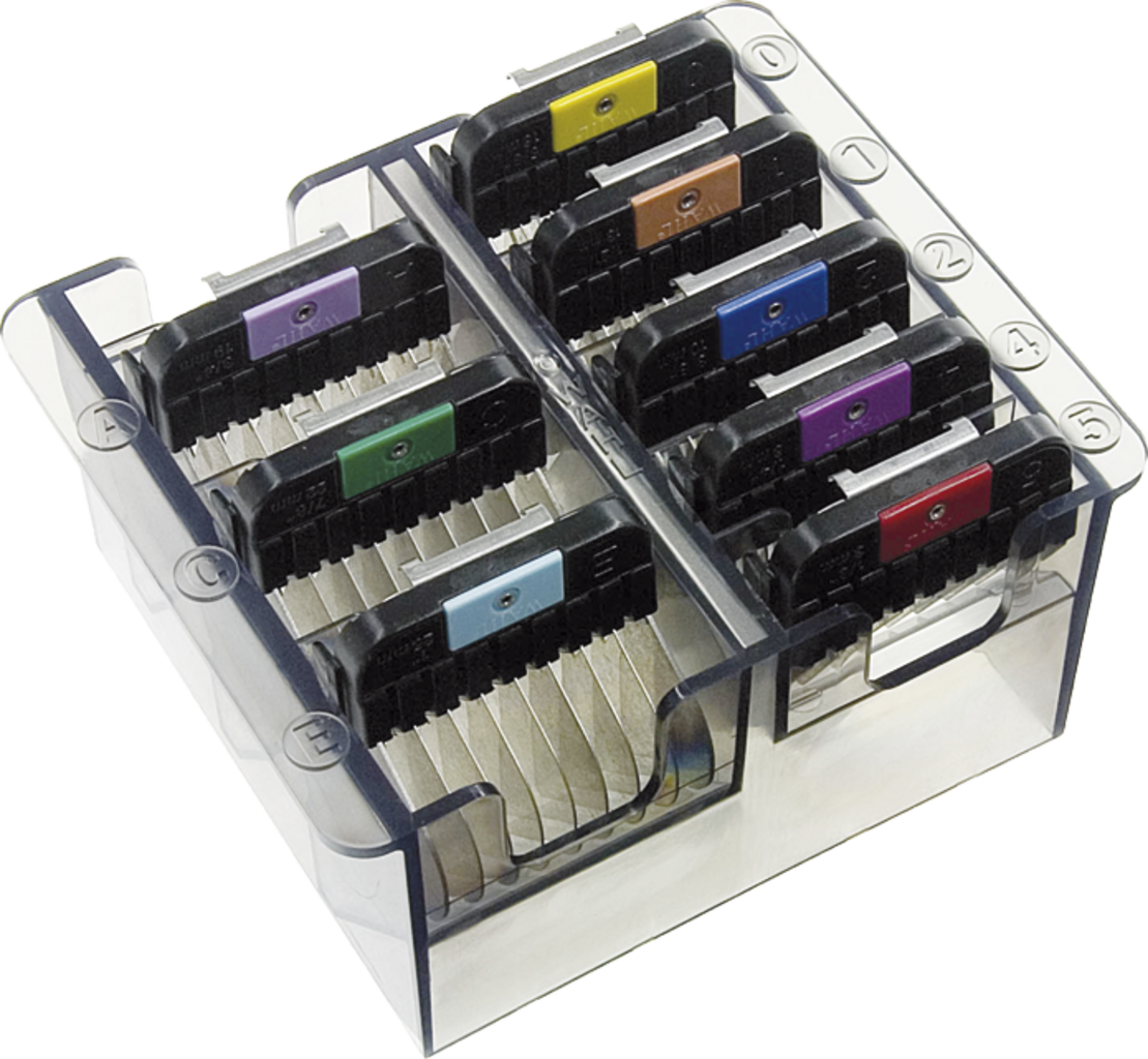Nastavki s sponko so barvno označeni za lažje prepoznavanje velikosti in so na voljo v praktični škatli za shranjevanje. Imajo tanke kovinske zobe, ki zagotavljajo odlične drsne lastnosti. Poleg tega material v primerjavi s običajnimi plastičnimi nastavki s sponko omogoča boljše ohranjanje oblike in enakomernejše striženje (do 25 mm).