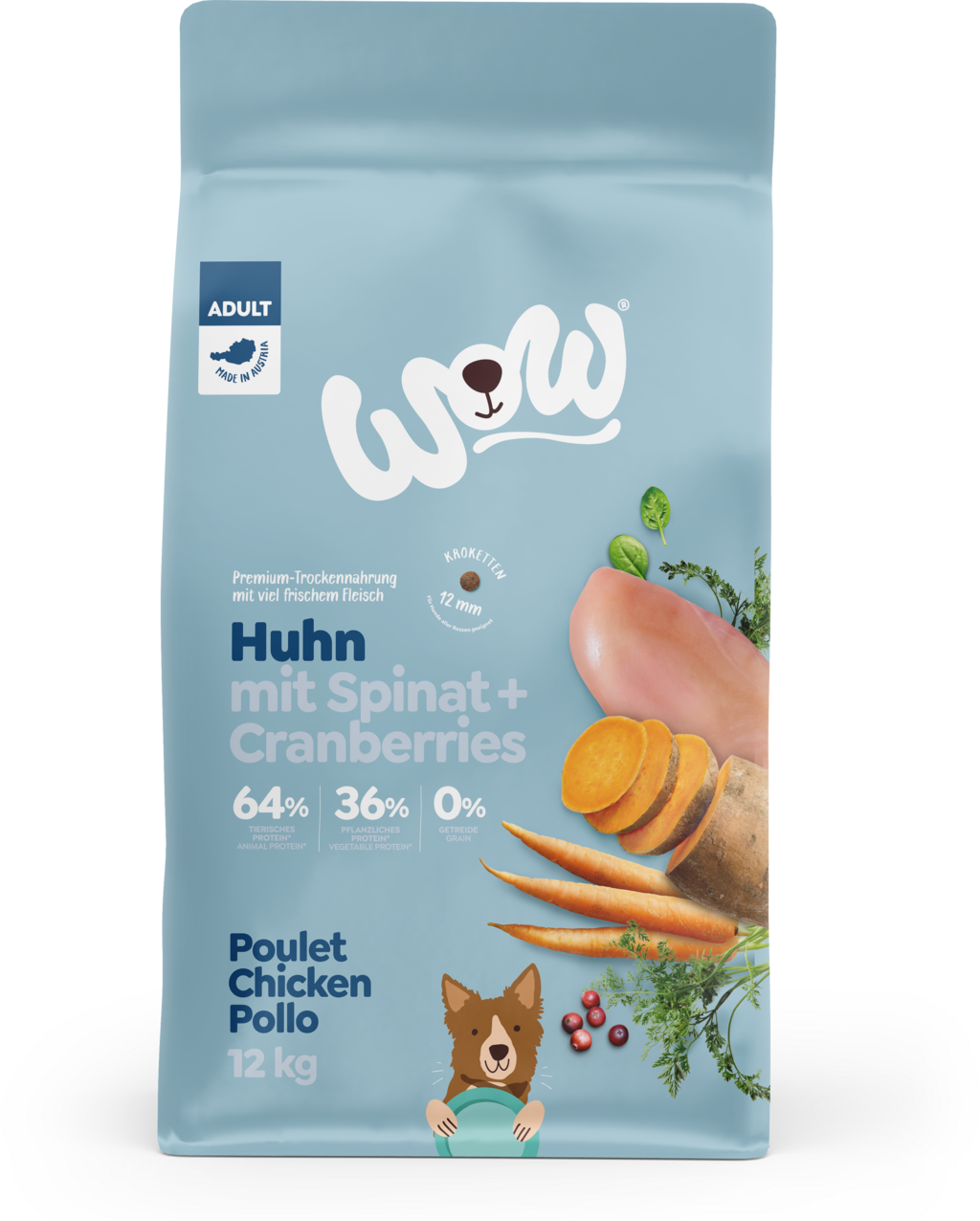 Suha pasja hrana ADULT - piščanec znamke WOW bo navdušila vse pse. Poleg mesa vsebuje tudi dragoceno zelenjavo in zelišča, brusnice in minerale. Recept ne vsebuje dodanega sladkorja, umetnih konzervansov in ojačevalcev okusa.