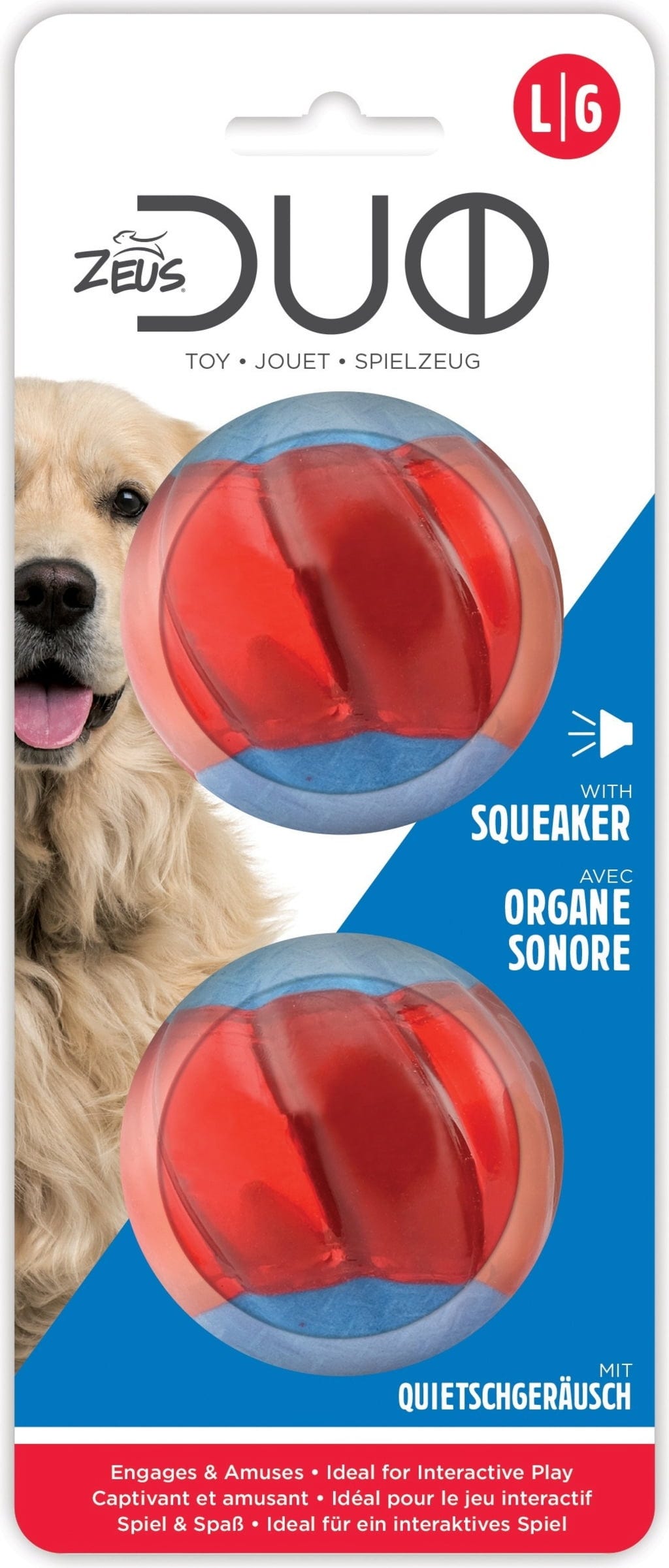 Če ima vaš štirinožni prijatelj rad piskajoče igrače, ga bo žoga Duo znamke Zeus dobesedno očarala! Piskajoča zabava pri igri, ne glede na to, ali ste notri ali zunaj, je zagotovo zagotovljena!