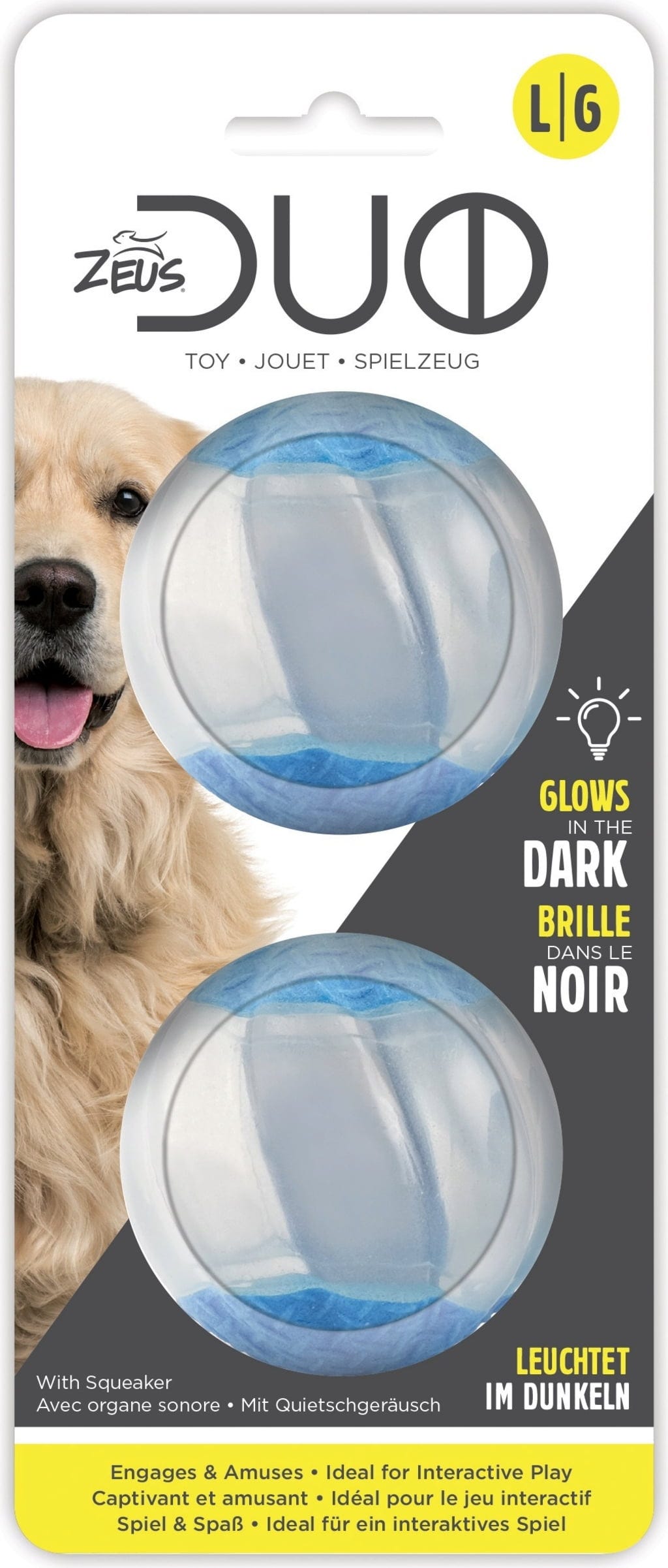 Trpežna žoga Duo znamke Zeus je idealen spremljevalec za vašega igrivega štirinožca! Žoga iz fosforescentne TPR gume ne le piska, temveč tudi sveti v temi: napolni se pod močno svetlobo in ponoči čudovito sveti. Dvojna zabava – podnevi in ponoči – je zagotovljena!